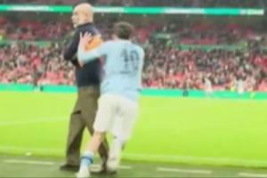 在裁判吹响终场哨后,谢尔基从替补席冲入球场庆祝,进场前还“偷袭”式的推了瓜迪奥拉一把,瓜帅则一脸懵的回头看了谢尔基一眼。