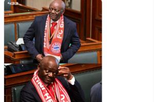 孔帕尼父亲、比利时议员皮埃尔·孔帕尼今天戴着拜仁围巾参加议会。