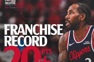 伦纳德单赛季连续45场比赛得分20+,超越鲍勃·麦卡杜独占快船队史第一。